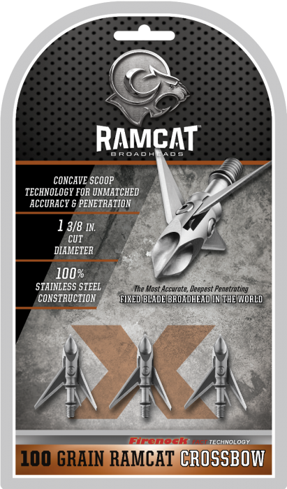 The most accurate, deepest penetrating fixed blade broadhead in the world. Incorporating proven aircraft technology, Ramcat is the first fixed broadhead that flies exactly like a field point when shot from any bow, at any speed. The patented Airfoil System creates field point accuracy while Firenock Aero Concentric Technology eliminates thread slip and the Back-Cut Technology features both front and rear sharpened blades that do as much damage penetrating a target as it does coming out. Hits like a Ram, Cuts like a Cat!