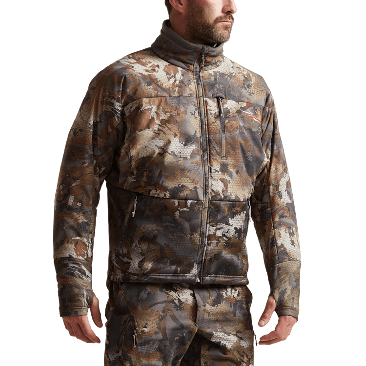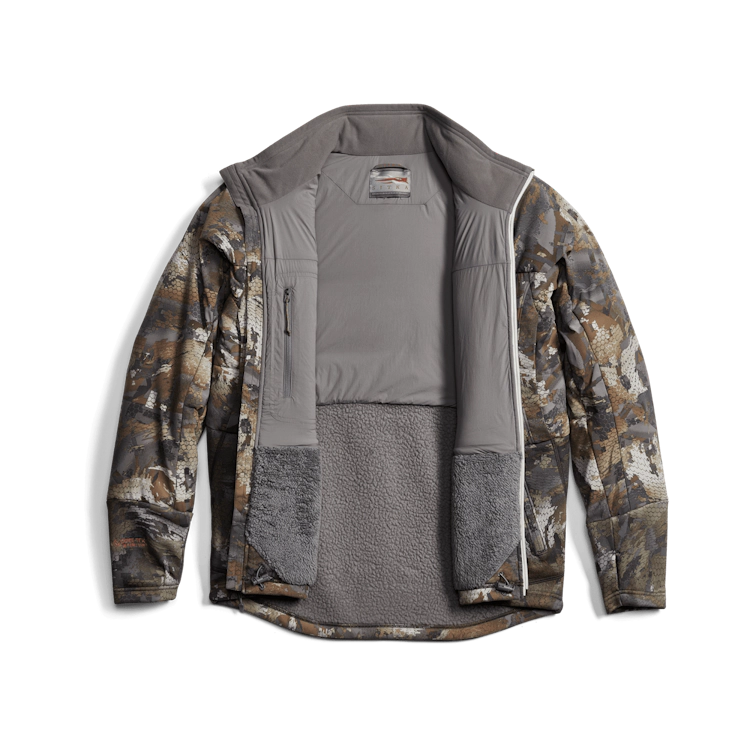 - Hybrid construction places compression-resistant fleece where it would fit under waders or bibs for mobility and warmth